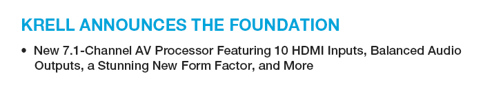 Orange, CT and Las Vegas, NV (CES) - January 9, 2013 - Krell Industries, LLC, the leader in high performance music and home theater systems, announces Foundation, the latest in a long line of state-of-the-art A/V processors. Featuring the latest digital connectivity, the Foundation also maintains Krell's exacting standards for analog audio reproduction.