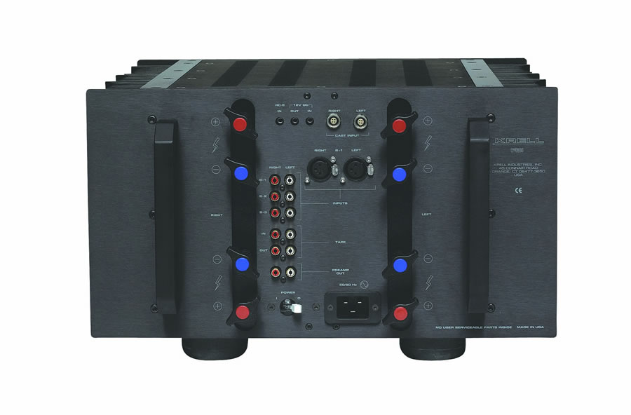 The amplifier features 300 W Krell Current Mode Topologies and balanced output stages.