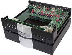Owing to Krell’s work in the Modulari Duo Reference loudspeaker, the unique crossover feature is a highly sophisticated option. When the optional board is present, additional crossover menu items become available. Definable parameters include independently assignable crossover frequencies and filter types for the high and low pass sections. Choices include 40Hz, 55Hz, 75Hz, and 100Hz crossover points with 12dB, 24dB, and 48dB Butterworth or 24dB Linkwitz-Riley style filters. The high pass section of the crossover uses the full Illusion preamplifier circuitry for its output stage.